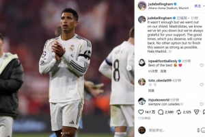 体育资讯4月18日讯 本轮欧冠八强战次回合,皇马在客场3-4被拜仁双杀。中场贝林厄姆在赛后通过社媒发文。