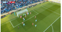 曼城角球机会,胡桑诺夫打门被封堵哈兰德再射中柱!